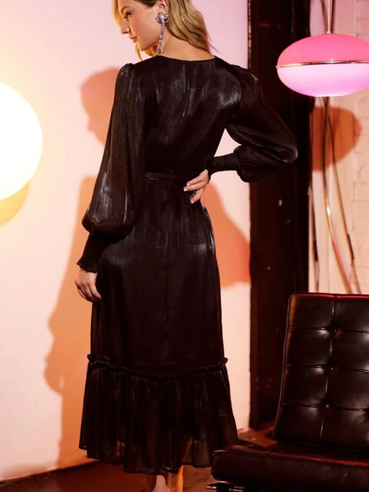 Late Night Wrap Long Bishop Sleeve Midi Dress Black Medium, Large