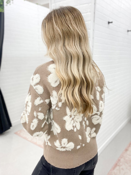 Ever After Floral Distressed Crewneck Sweater Taupe