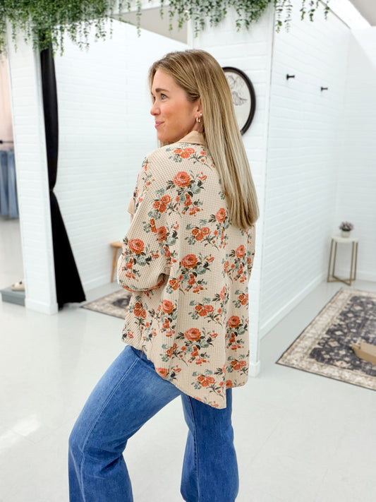 Bloom Today Floral Print Washed Waffle Shirt Jacket Taupe