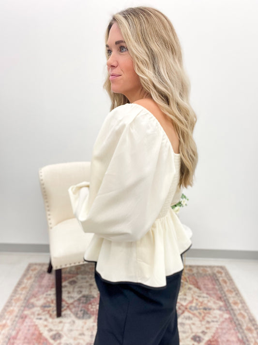 Sweet To Me Bow Detail Peplum Top Cream/Black Large