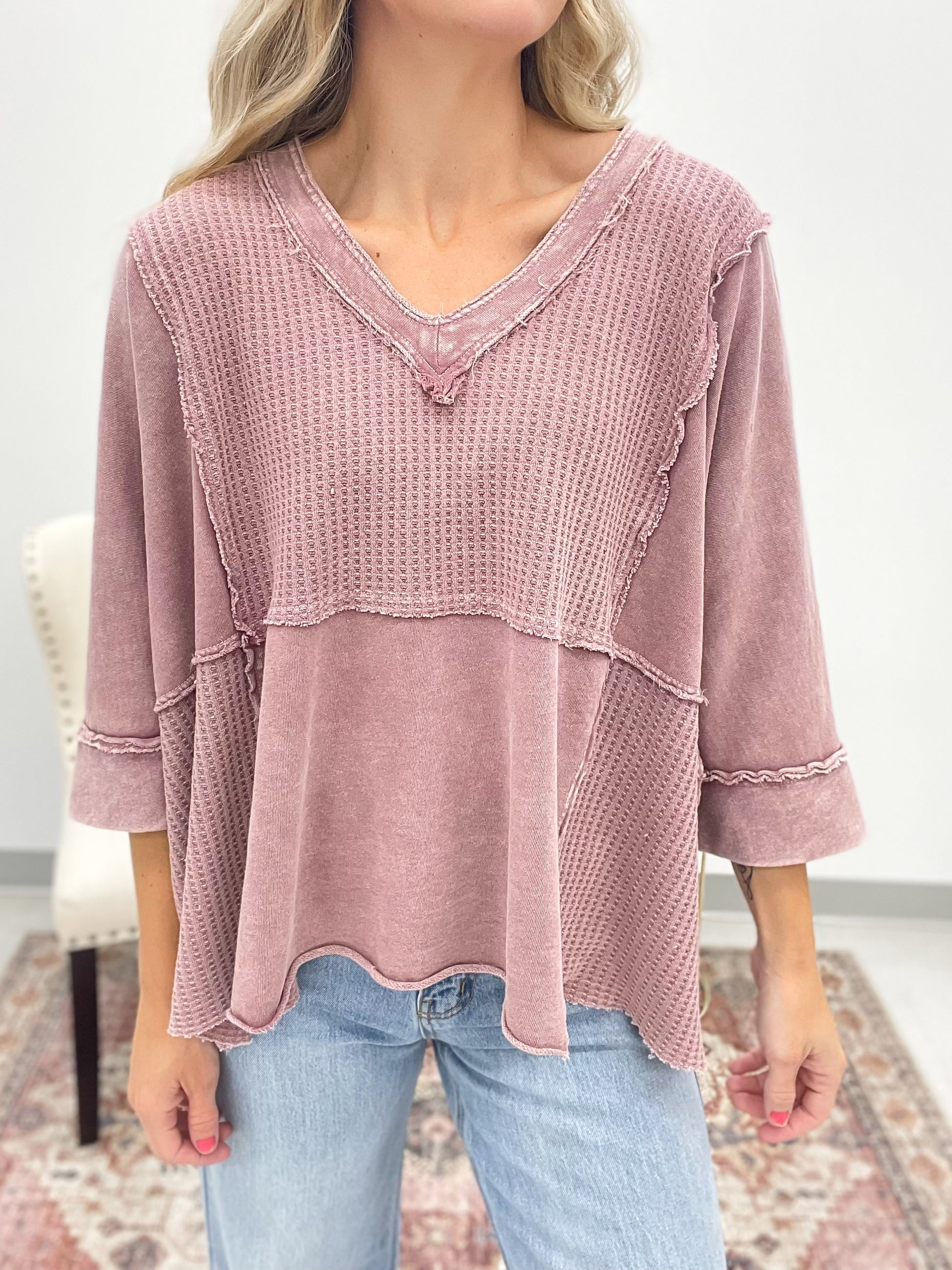Experience effortless style with the After Time Thermal Knit Mineral Wash Top in Mauve. Featuring an emphasized V-neck and waffle knit panel detailing, this top combines comfort with subtle texture. Side slits and a raw cut hem enhance its relaxed, loose fit, making it perfect for layering or wearing on its own. Embrace casual elegance with a piece designed to keep you comfortable and stylish all day long.
