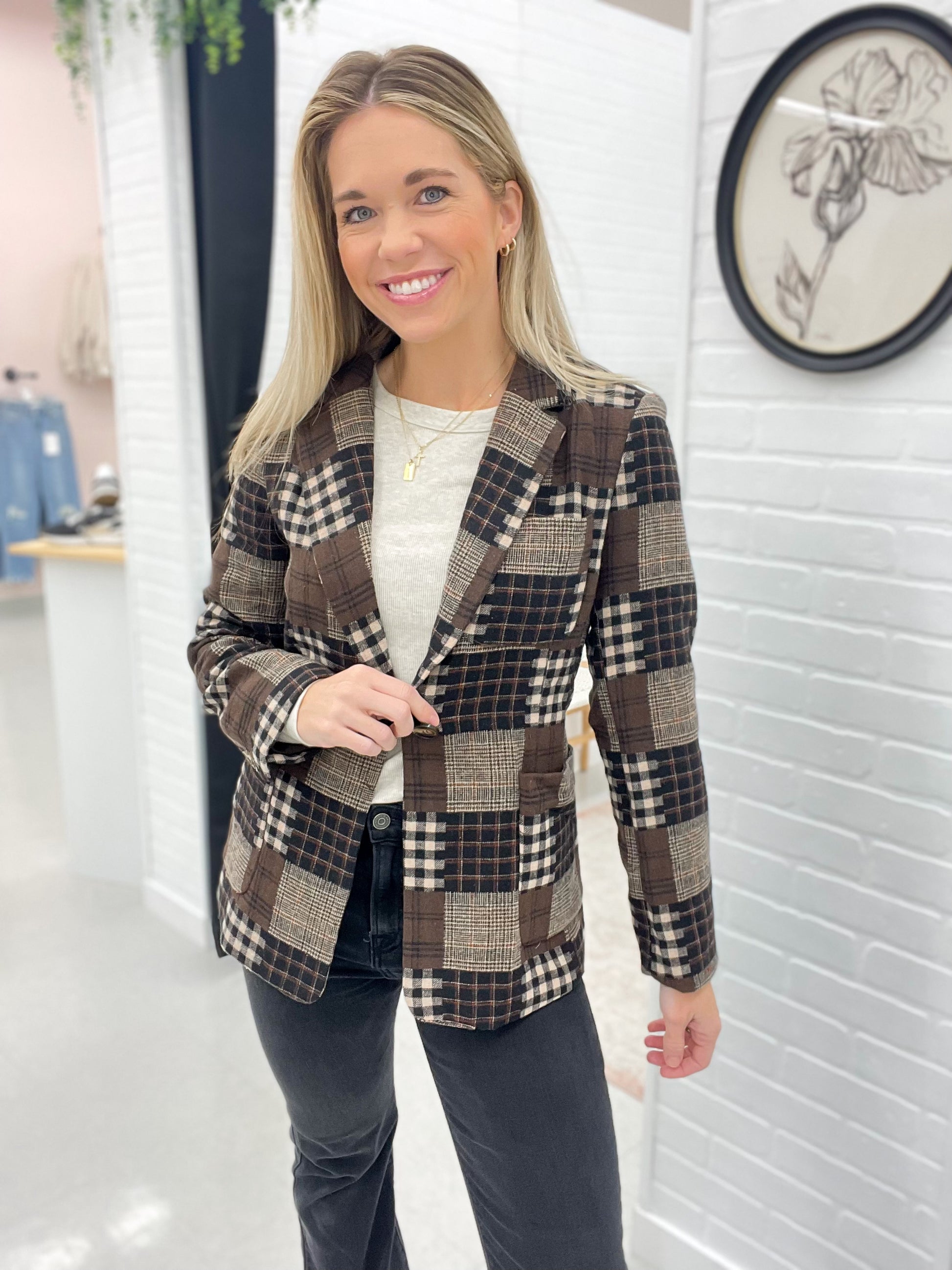 Elevate your wardrobe with this sophisticated soft blazer featuring an elegant blend of mixed plaid and houndstooth patterns in rich brown and black tones. Designed with a smooth inner lining for comfort, it fastens with a single button for a sleek, polished silhouette—ideal for making a refined statement in any professional or stylish setting.