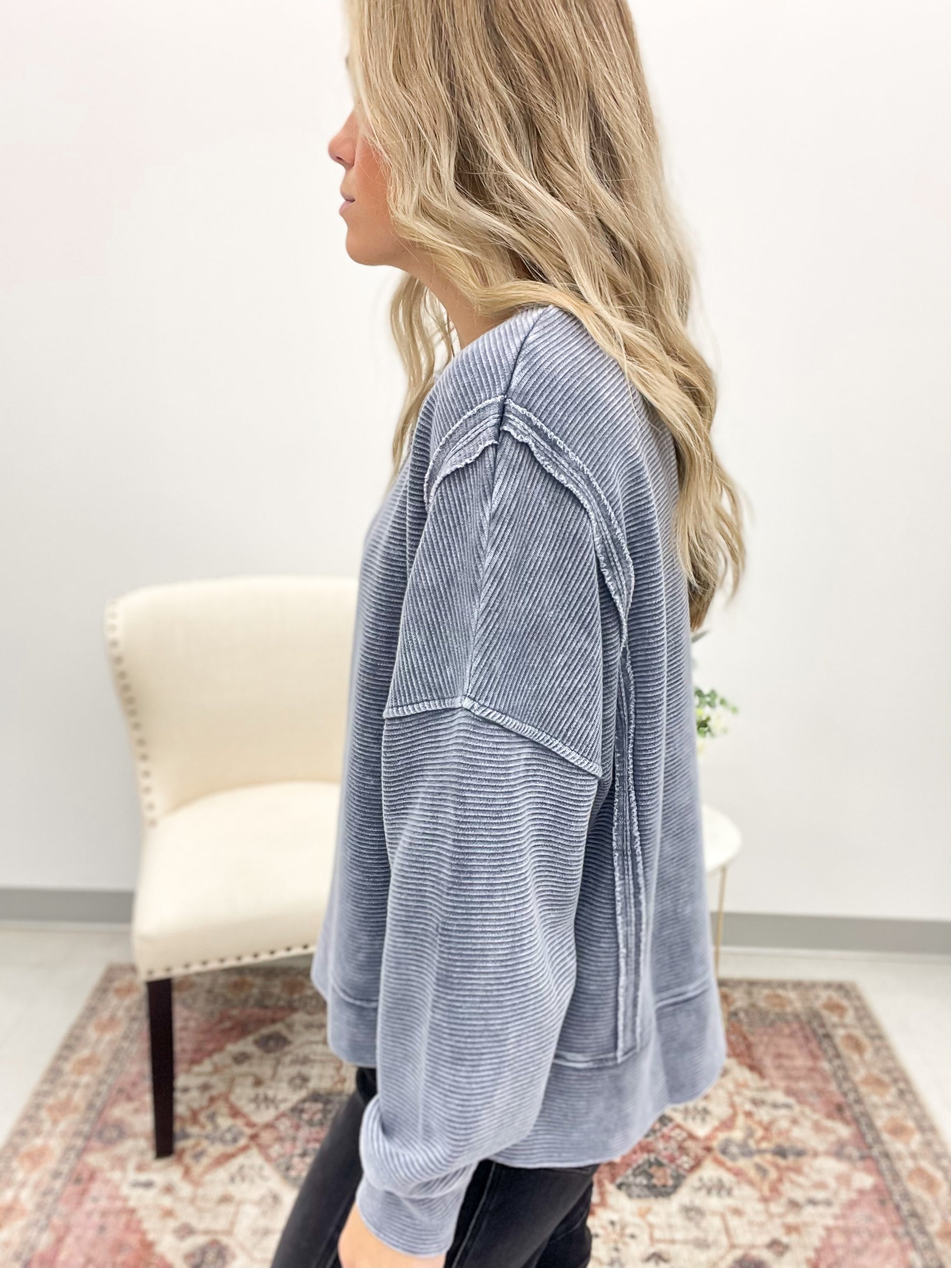 Elevate your casual wardrobe with the Carry On Washed Exposed Seam Detail Top in Blue. Featuring a comfortable round neckline and long sleeves with a relaxed drop shoulder design, this knit top offers effortless style. Side slit and raw trim details add a modern edge, while the washed pattern gives it a unique, lived-in look. Perfect for layering or wearing on its own, this top combines comfort and distinctive design to keep you looking effortlessly chic.