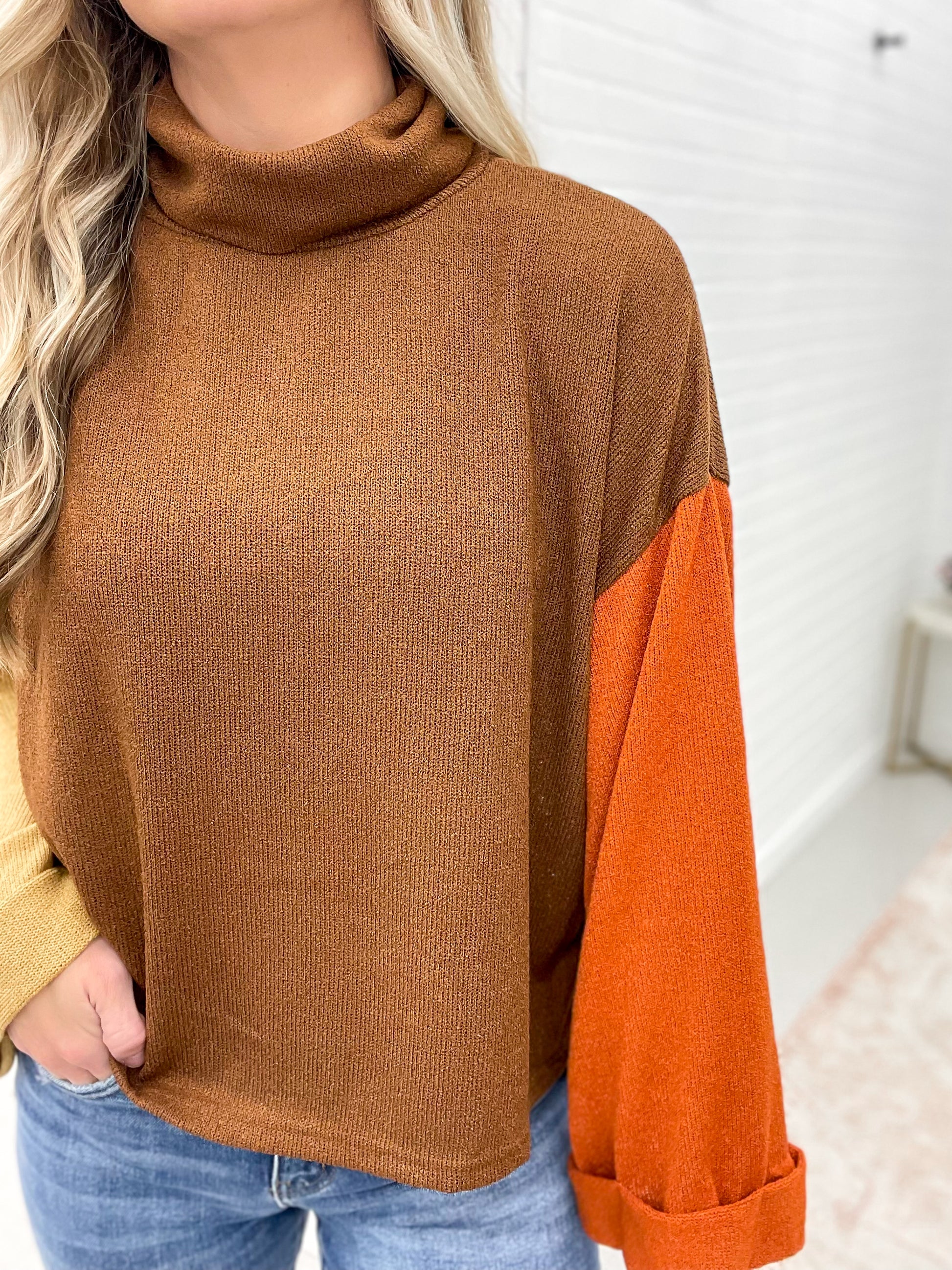 Celebrate the season with the Giving Thanks Sweater. Featuring a fall-inspired color block design and chic bell sleeves with rolled hem for a stylish touch. This mock neck knit sweater is the perfect addition to your Thanksgiving wardrobe.
