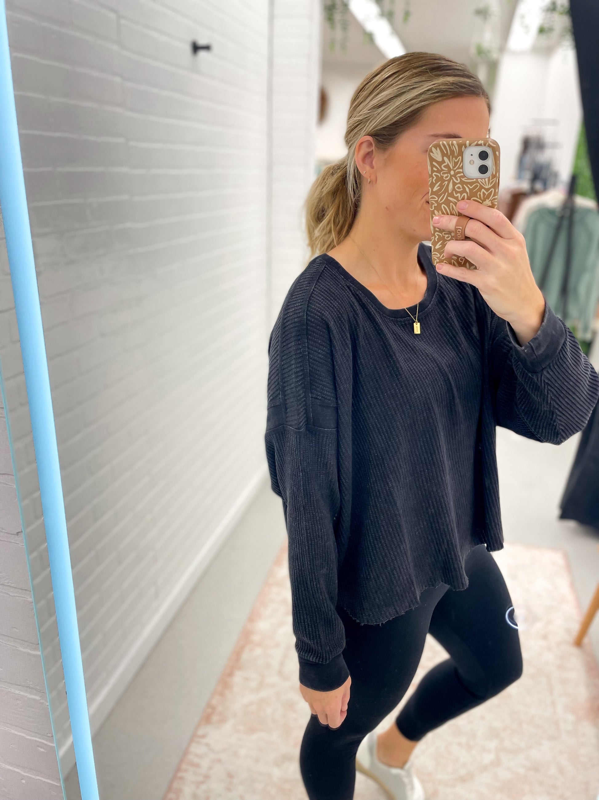 Her Time Waffle Knit Open Back Long Sleeve Top Black
