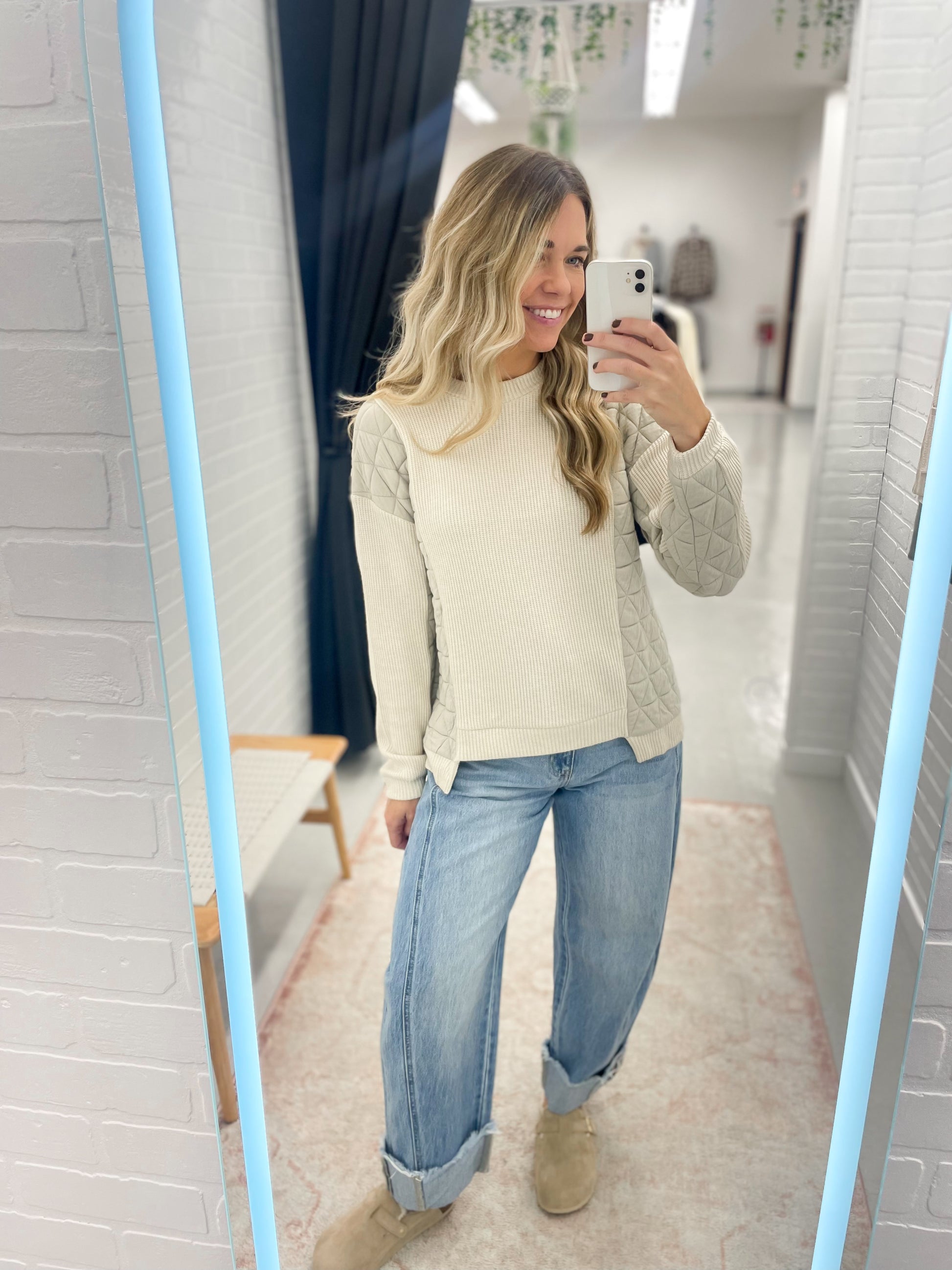 Stay comfortable and stylish with the Hidden View Mixed Fabric Crew Neck Top in Cream. Featuring a unique combination of quilted and knit fabrics, this cozy sweater provides warmth and texture for everyday wear. The uneven front hem adds a modern twist to a classic design, making it perfect for layering or standing out on its own. Ideal for cool days, it effortlessly blends comfort with a subtle edge to elevate your casual wardrobe.