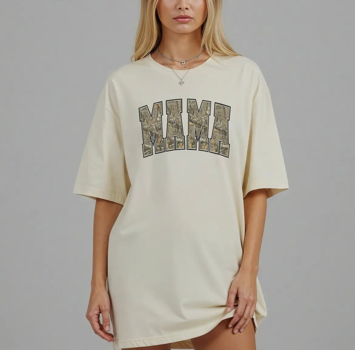Make a statement with the MAMA Camouflage Crewneck Tee in Cream. Featuring a bold mama camo print, this Comfort Colors Tee blends comfort with eye-catching style. For a relaxed, oversized fit that’s perfect for layering, simply size up and enjoy a trendy, fashionable look that stands out.