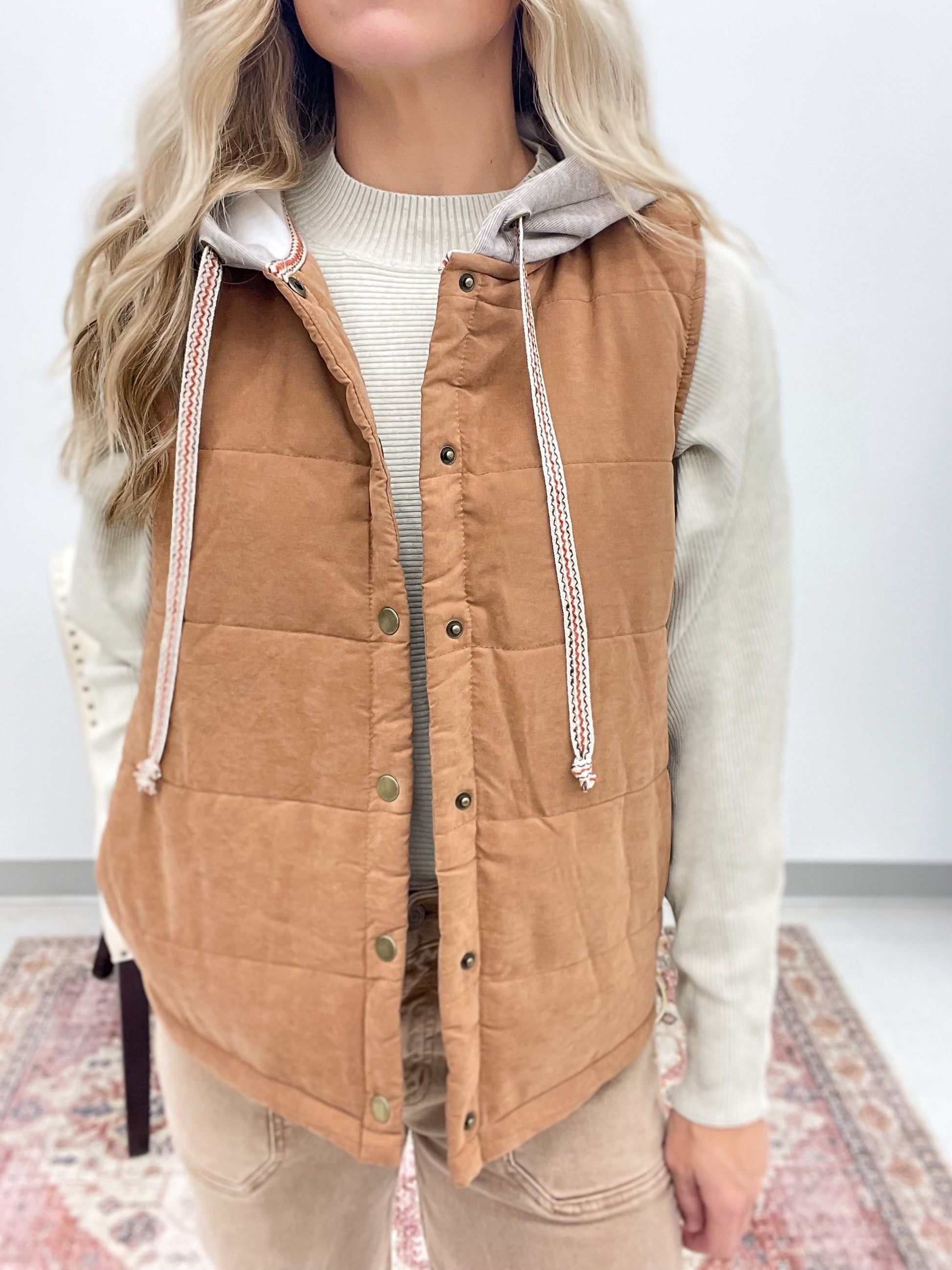 Stay stylish and prepared for cooler days with the Miles Ahead Hooded Puffer Vest in Rust. Featuring a cozy hood and convenient side pockets, this trendy vest offers both warmth and practicality. Its sleek design makes it a versatile addition to any wardrobe, perfect for layering on the go. Elevate your outerwear game with comfort and modern style combined.