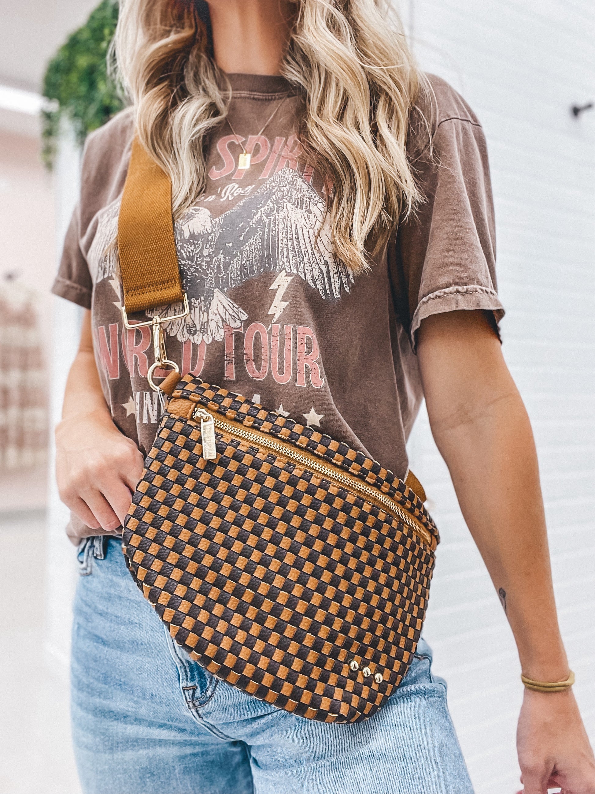 Elevate your style with the Westlyn Woven Bum Bag! Made from gorgeous light and dark brown vegan leather, this crossbody bag exudes edgy, rocker vibes. The hardware and chevron interior add a touch of sophistication, while the zipper closure and slash pocket provide functionality. A must-have accessory to elevate any outfit with adjustable shoulder strap!