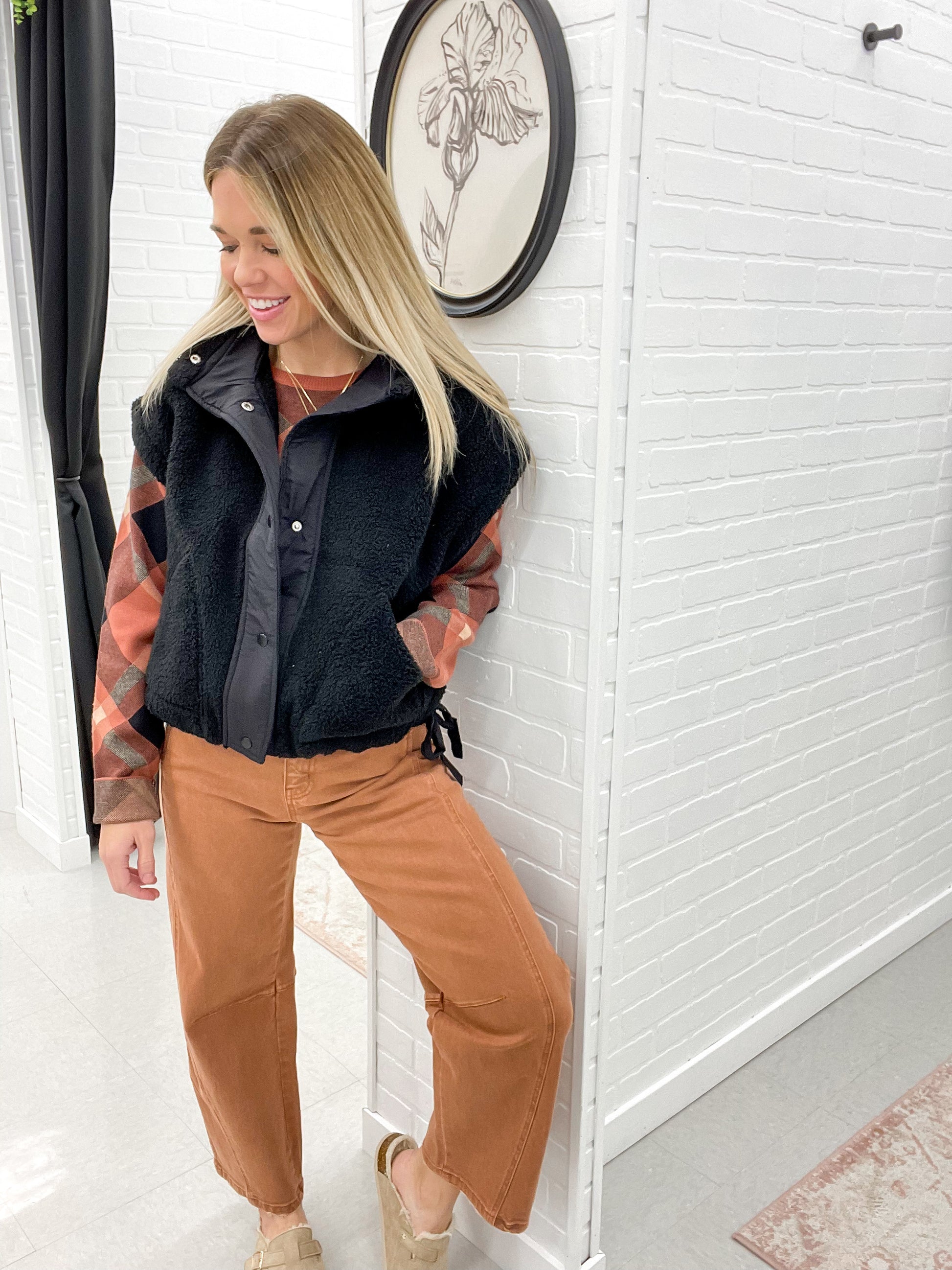 Embrace comfort and style with our Gone Too Fast Sherpa Vest! Perfect for layering, this jacket features functional side tie-ups for a snug, adjustable fit. With its snug mock neck and button down front, it's easy to wear and ideal for transitioning seasons. Pair with your favorite jeans or leggings for a cozy, on-trend look!