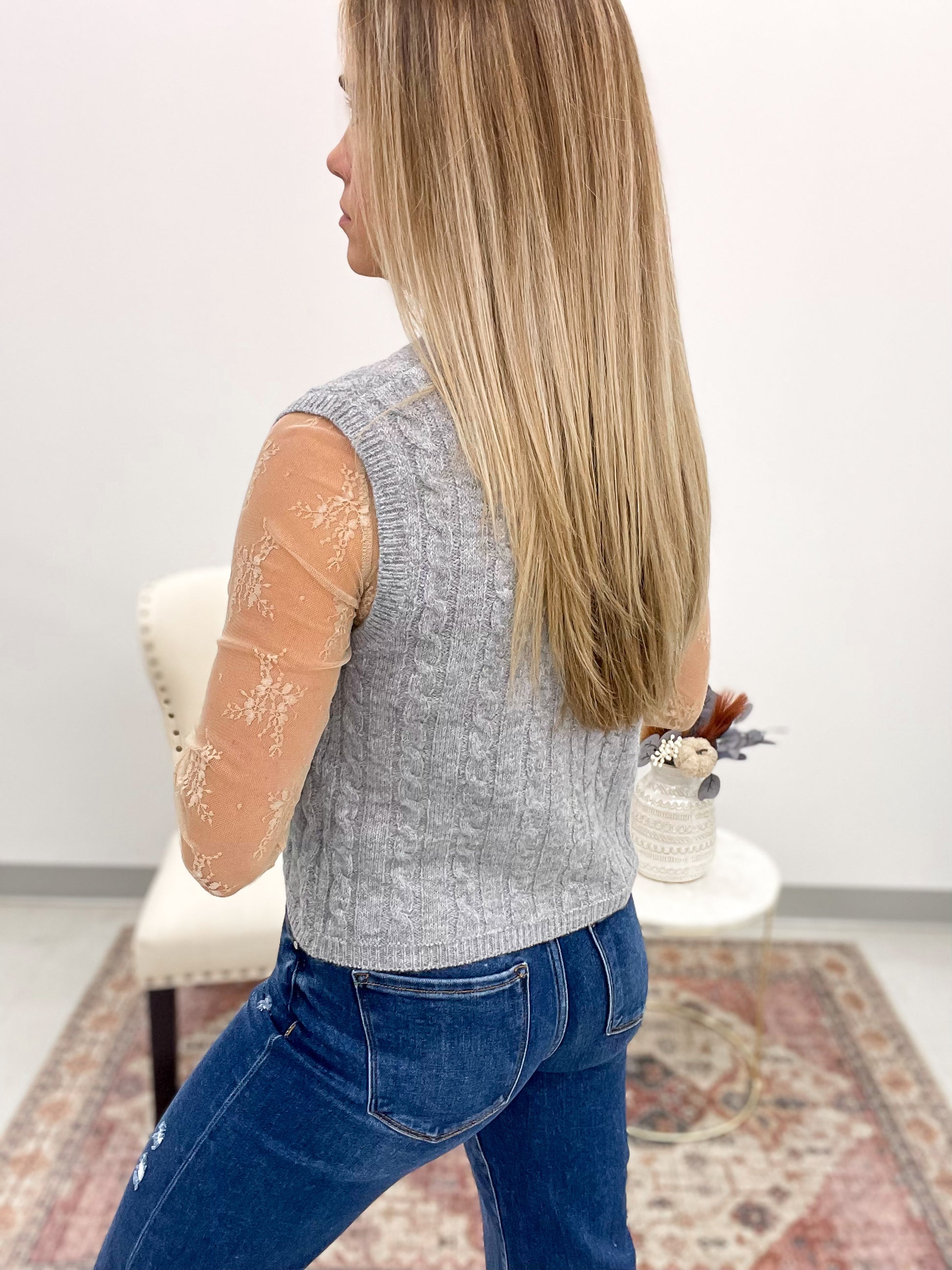 Add a dash of cozy charm to your layering game with the Where We Started Cable Knit Button Up Sweater Vest in Heather Gray. This playful vest features a classic cable knit design and a flattering V-neck that pairs perfectly over your favorite lace long sleeve. With button-down ease and handy front pockets, it’s ideal for keeping things stylishly snug while adding a fun, textured twist to any outfit. Perfect for those who love mixing comfort with cool!